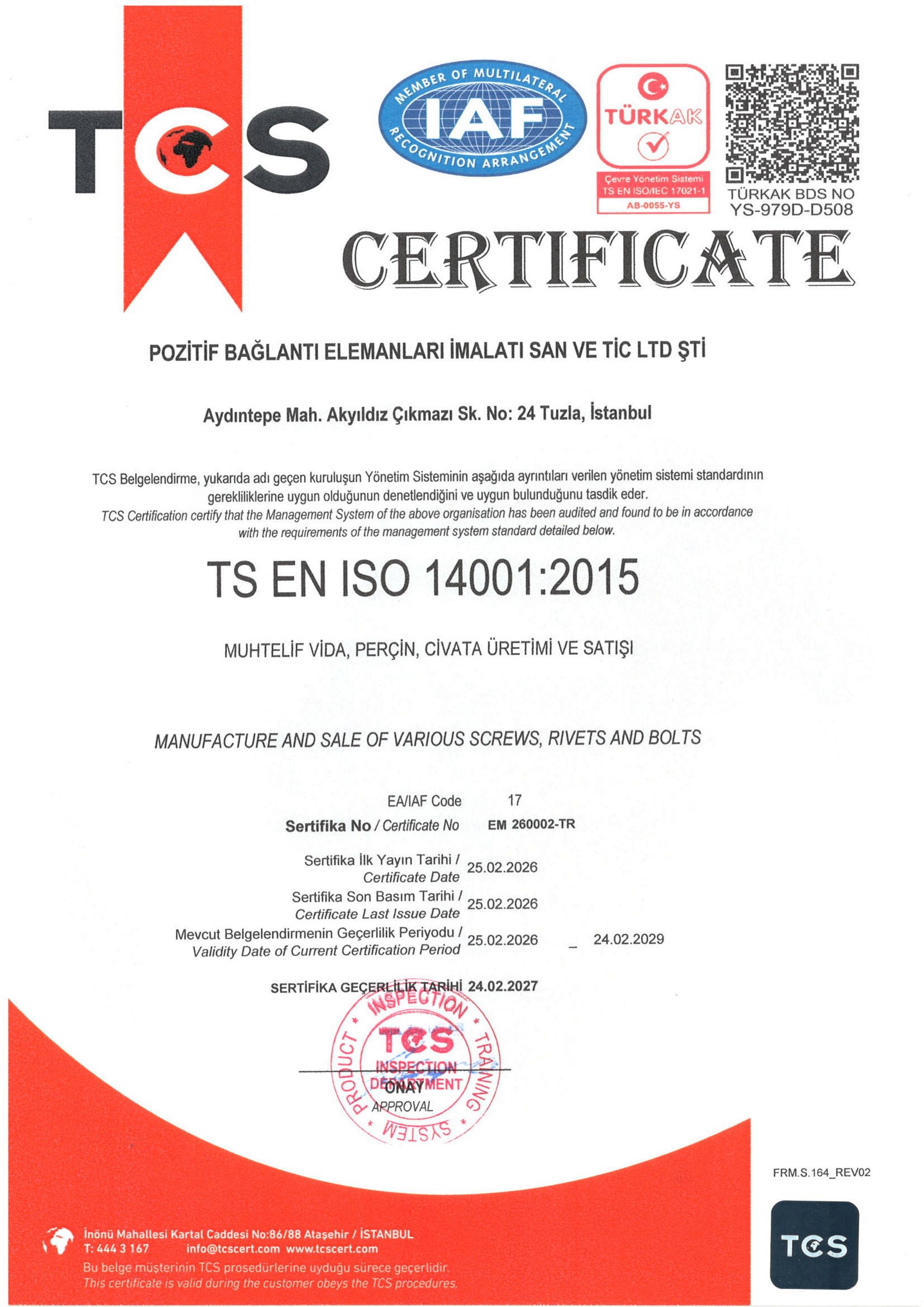 ISO 9001 ve ISO 14001 Belgelendirme Kapsamı;