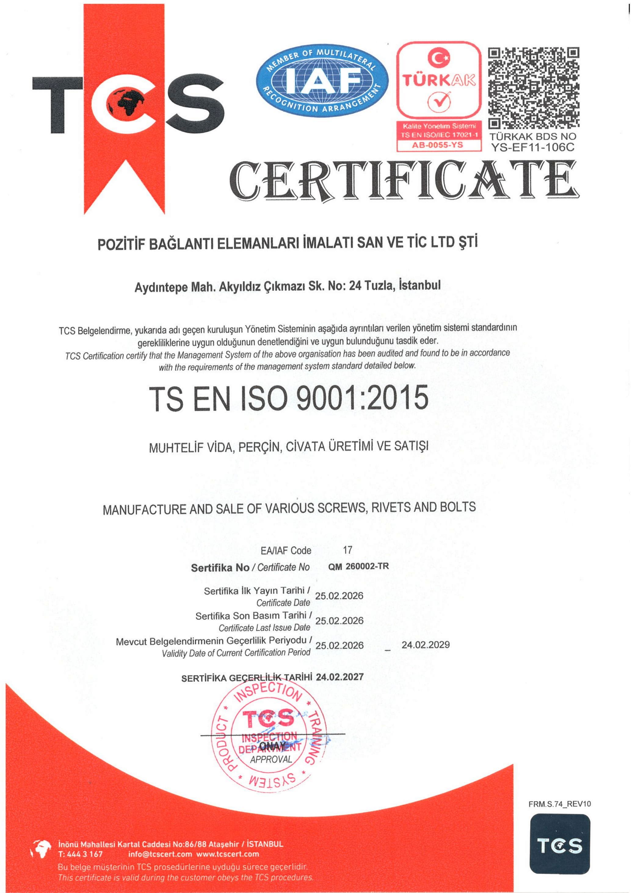 Pozitif Bağlantı; bağlantı elemanları imalatında kaliteden ödün vermeden üretim yapmayı, ulusal ve uluslararası standartlara uygunluğu sağlamayı, müşterilerine uygun hizmet verme amacı ile talep ve beklentileri karşılayacak nitelikte sürekli gelişmeyi hedeflemektedir.